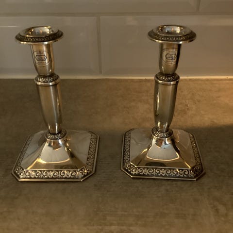 Alustan leveys 85 mm, korkeus 70 mm. Kotimaiset leimat, 830H. Hyvässä kunnossa mutta ovat tummuneet, joten kiillotus jää ostajalle. Kokonaispaino on 413 g, kahdessa jalassa on täyte ja yhdessä jalassa on metallipohja. Voin lähettää, noin 8 e.