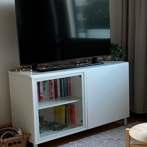 Uuden veroinen hylly lasi-ovilla.