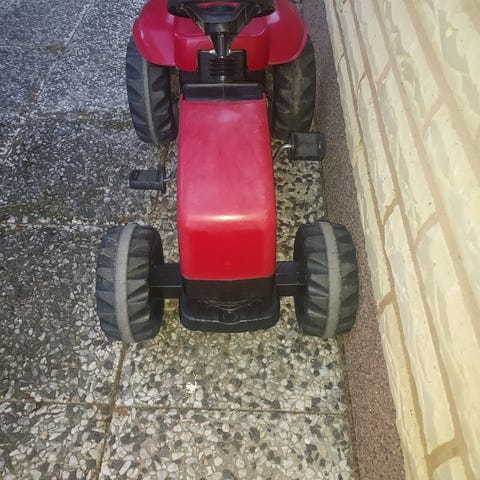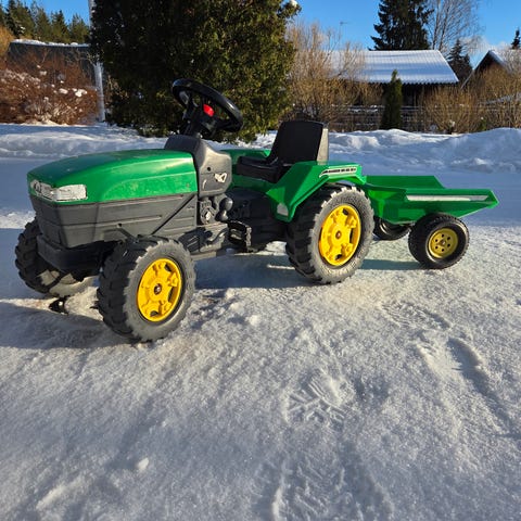 BRIO polkutraktori peräkärryllä. Traktori ja kärry ovat sinistä muovia, renkaat ovat leveät ja kuvioidut muovirenkaat. Ohjaus tapahtuu valkoisesta ratista, ja peräkärry on kiinnitetty vetokoukulla traktorin taakse. Kärryssä on ritilämäinen pohja. Soveltuu lapselle ulko- ja pihaleikkeihin ajettavaksi ja tavaroiden kuljettamiseen.