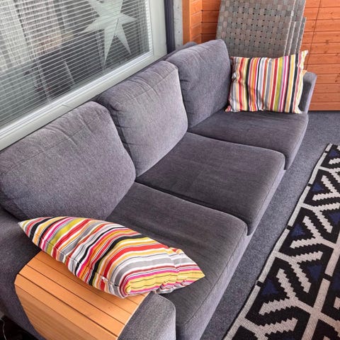 Asko sohva vaaleanharmaalla kankaalla. Kolmen istuttava sohva, jossa irrotettavat istuin- ja selkätyynyt. Verhoiluna vaaleanharmaa kangas ja metallijalat. Kaupan päälle samaa kangasta oleva rahi. Kuljetuskin järjestyy lisäkorvausta vastaan. Nyt alessa!