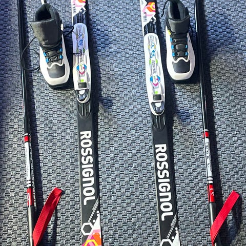Rossignol karvapohjasukset 150cm, sauvat 105cm ja Alpine monot koko 35.