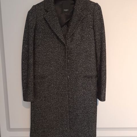 Takki on kirjavan ruudullinen. Edessä nappikiinnitys ja pitkä helma. Takissa on huppu, jossa tummempi karvayksityiskohta. Sopii käytettäväksi viileämpinä vuodenaikoina ulkotakkina.