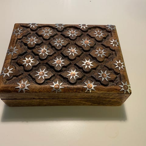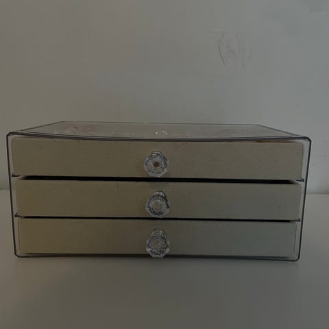Korurasia, jossa lasikansi ja päällä kruunukuvio sekä teksti "Jewelry". Rasia on valkoinen ja sisällä on useita lokeroita korujen säilytykseen. Koko 20 x 8 cm