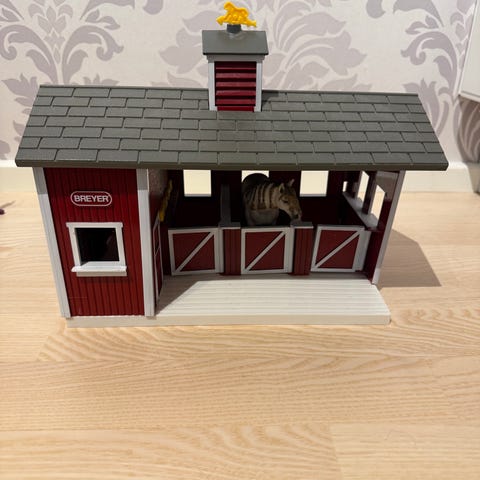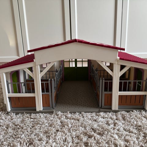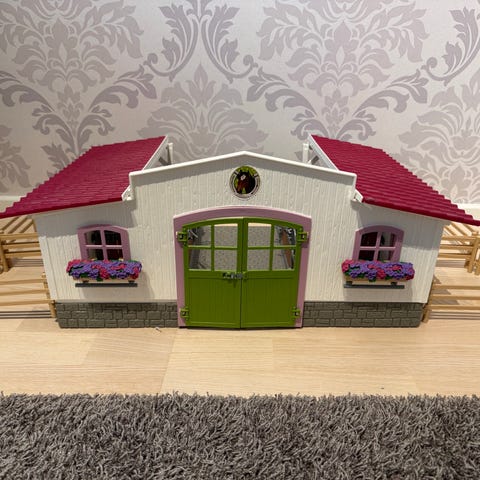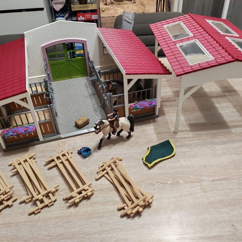 Schleich talli 42110. Hyvässä kunnossa. Aidat karsinoiden ulkopuolella puuttuu. Kaikki juoma- ja ruokakipot sekä satulapidikkeet tallessa. Mukana tulee myös kuvassa näkyvät tarvikkeet.
