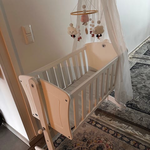 Pinnasänky vauvalle, renkaat alla, joten saa liikuteltua. Pohjaa saa säädettyä eri korkeuksille.
