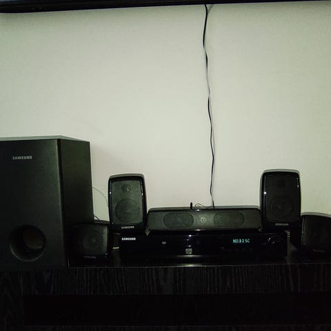 Samsung DVD-stereosarja kaiuttimilla. Järjestelmään kuuluu DVD-soitin, kaksi kaiutinta, kaukosäädin, käyttöohje ja tarvittavia kaapeleita. Soittimessa on etupaneelissa DVD-levypaikka, USB-liitäntä ja kuulokeliitäntä. Takapaneelissa on useita liitäntöjä, kuten HDMI OUT, SCART, AUX IN, komponentti- ja komposiittivideoliitännät sekä kaiutinliitännät. Väri on musta. Sopii esimerkiksi television tai muun äänentoiston lähteen liittämiseen ja DVD-levyjen toistoon kotikäytössä.