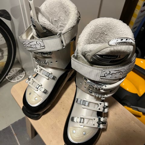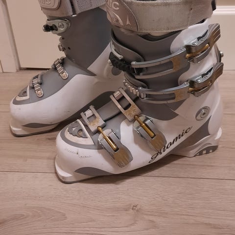 Atomic naisten laskettelumonot myynnissä. Viininpuna-valko-mustat kahdella soljella joka helpottaa pukemista. Leveä lesti, koko 26-26,5 vastaa n kokoa 40.