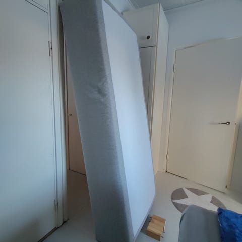 Käytetty joustinsänky 80x200 cm, sisältää jalat. Ei sisällä sijauspatjaa. Harmaa verhoilu. Sängyn korkeus jalkojen kanssa 45 cm.