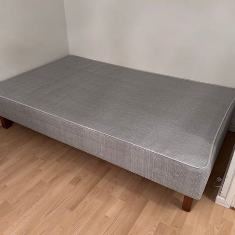 Kotimainen 120cm leveä sänky, hiekan värisellä kankaalla ja tummat jalat.