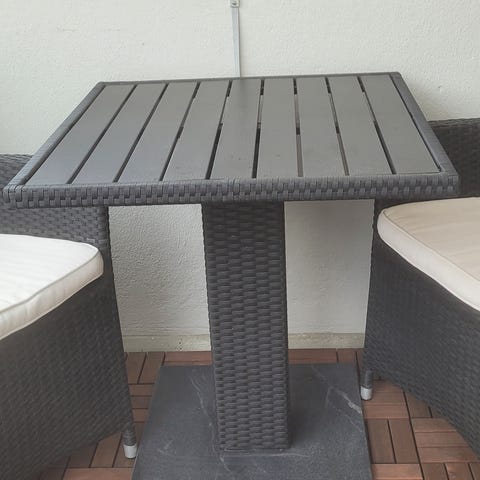 Terassisetti jossa kaksi taitettavaa tuolia ja ovaalinmuotoinen taittopöytä. Tuolit ja pöytä vetävät puoleensa yksinkertaisella ja funktionaalisella muotoilullaan. Taittomekanismi mahdollistaa helpon säilytyksen.Ilmoituksessa pöydän mitat. Selkeää kulumaa pinnoilla.