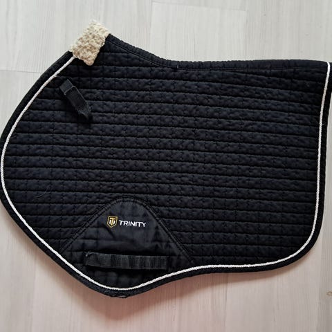 Valkoinen trinityn yleissatulahuopa kokoa Full. Huovassa on tikattu ruutukuvio ja tarralla aukeavat vyölenkit satulavyötä varten. Todella siistissä kunnossa, mitään suurempia käytönjälkiä ei ole.