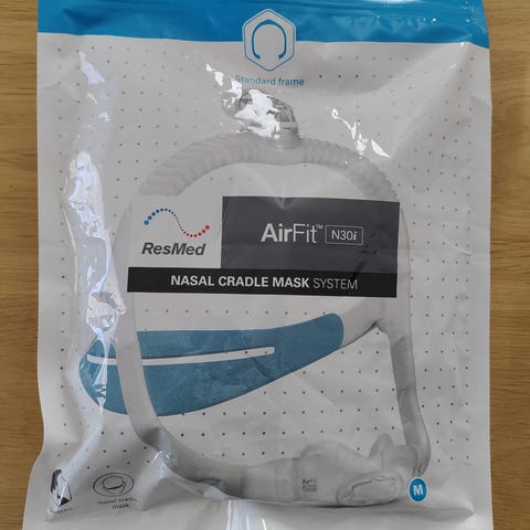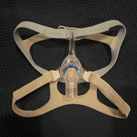 CPAP-kokokasvomaski koko M hengityshoitoon. Mukana joustava letku ja pään ympäri tulevat säädettävät kiinnityshihnat. Maskiosassa läpinäkyvä muovinen runko ja pehmeä silikonitiiviste kasvoja vasten. Letkussa pikaliitin CPAP-laitteeseen liittämistä varten. Liitin käy ainakin Resmed AirSence 10 laitteeseen.