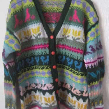 Lasten neulatakki. Mitat olkapäästä helmaan 46 cm, kainalosta kainaloon 33 cm, hihan pituus 31 cm ja hihan pituus kainalosta mitattuna 31 cm. Käsinkudottu.
