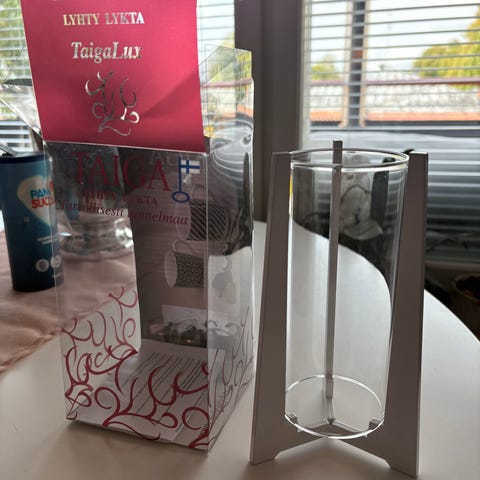 Taiga TaigaLux lyhty. Pakkauksessa oleva lyhty on tarkoitettu turvalliseen kynttilän tai muun valonlähteen käyttöön. Tuote soveltuu sisä- tai ulkokäyttöön valmistajan ohjeiden mukaan. Materiaali ja tarkat mitat eivät käy ilmi pakkauksesta.