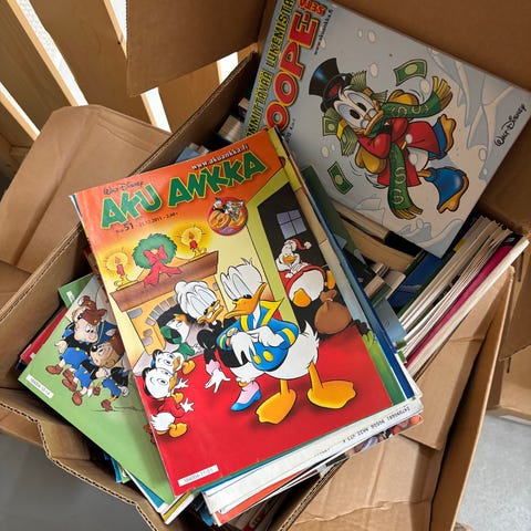 Aku Ankka sarjakuvakansiot ja lehdet. Kokoelma sisältää Aku Ankka -sarjakuvalehtiä sekä punaisen Aku Ankka -aiheisen säilytyskansion. Kansiota voi käyttää lehtien säilyttämiseen ja järjestämiseen. Sarjakuvat ovat suomenkielisiä ja sopivat luettavaksi lapsille ja aikuisille, jotka pitävät Disney-hahmoista ja erityisesti Aku Ankasta.