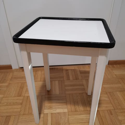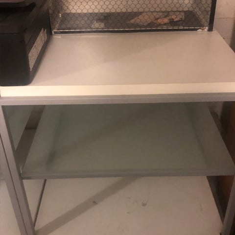 Kaksi harmaa pöytää hyvässä kunnossa, vain yksi naarmu.