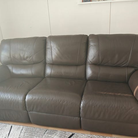 Ruskea nahkainen sohva, jossa mahtuu lapsi nukkumaan. Sohva tyynyjen alla patja 68 x 140 cm. Nahka patinoitunut. Kangasosissa värjäymiä.