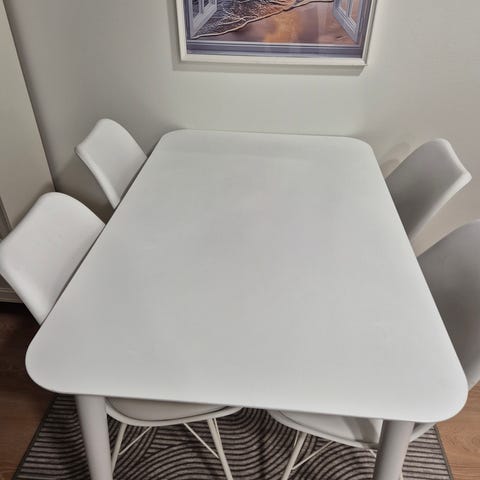 Myydään pois ylimääräisenä siisti ruokailuryhmä. Muutama ihan pikku jälki pöydän kannessa, muuten ei mitään mainittavaa.