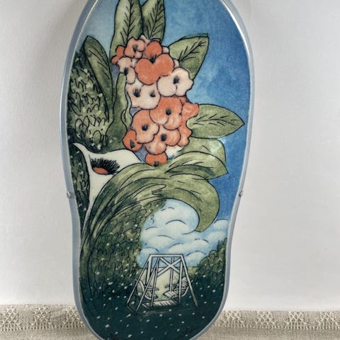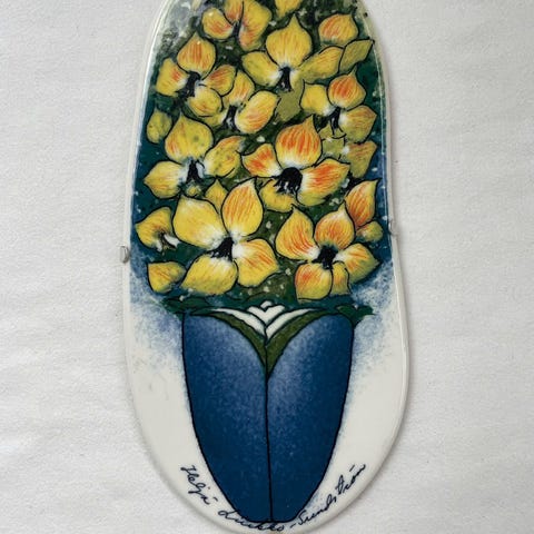 Arabia seinälaatta, keraaminen koriste-esine. Laatan pinnassa on monivärinen kukkakuvio, jossa korostuvat keltaisen ja sinisen sävyt. Sopii käytettäväksi sisustuksen seinäkoristeena esimerkiksi olohuoneessa, keittiössä tai eteisessä. Merkitty taiteilijan signeerauksella alaosassa.Heljä Liukko - Sundström,koko 23cm x11 cm