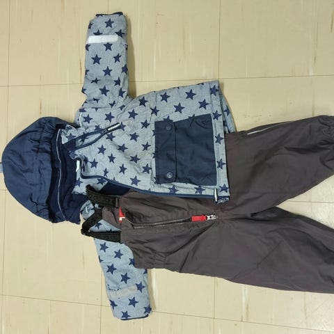 Tyttöjen toppatakki ja toppahousut henkseleillä. Söpö piippahuppu. Kunnossa ei moitittavaa.
