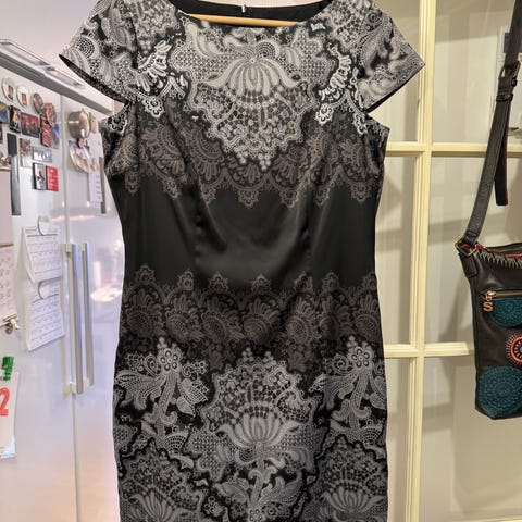 Esprit naisten mekko koossa 38. Väri on musta ja materiaali polyesteriä. Mekossa on lyhyet hihat, pyöreä pääntie ja polvipituinen helma. Helmassa on kevyesti laskostettu ja kerrostettu yksityiskohta toisella sivulla. Sopii arki- ja juhlakäyttöön. Hyvä kunto.