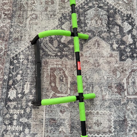 Säädettävä leuanvetotanko sisäovien karmiin tai muuhun sopivaan kiinnityspaikkaan. Materiaalina metalli, pinnassa krominvärinen viimeistely. Tangossa on mustat pehmustetut otepinnat molemmilla puolilla paremman otteen ja käyttömukavuuden vuoksi.