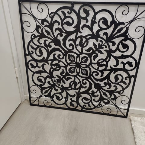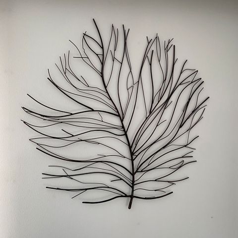 Metallinen, tumman ruskea lehden mallinen koriste esine. Koko n 75 x 75cm