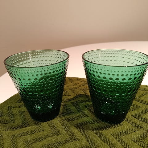 Iittala Kastehelmi juomalasit. Design Oiva Toikka. Olleet tosi vähällä käytöllä, en löydä laseista moitittavaa. Sammaleen vihreissä laseissa on pohjassa vielä tarrat jäljellä.