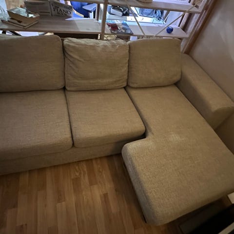 Hakemisen vaivalla sais kulmasohvan. Hieman nitisee jotkut kohdat sohvasta, pesu jää hakijalle. Mukaan saa rahin joka on repeytynyt toiselta puolelta (saa varmaan ommeltua kiinni). Kaikki palaset saa irti toisistaan ja kätisyyden pystyy vaihtamaan.