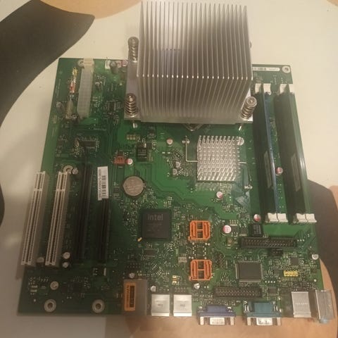 HP emolevy pöytätietokoneeseen. Emolevyssä on prosessorin jäähdytysripa sekä