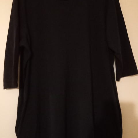 XLNT mekko, koko 56. Musta polyesterimekko, jossa valkoinen kuviointi helmassa ja pieniä kuvioita kauttaaltaan. V-kaula-aukko edessä ja puolipitkät hihat. Materiaali: polyesteri. Kainalosta kainaloon 67cm.