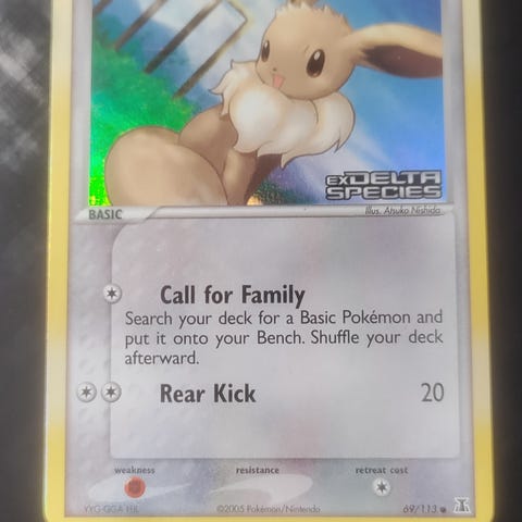 Eevee kortissa "pokepalloholo" ja Ex Unseen Forces logo. Kuvassa paljon (pieniä) naarmuja ja takapuolella kortissa on vähän isompiakin naarmuja. Kortin kunto vaikuttaa hintaan merkittävästi laskien hintaa. Reunat ovat ihan ok kunnossa. Saa pyytää lisää kuvia ja tarjota.