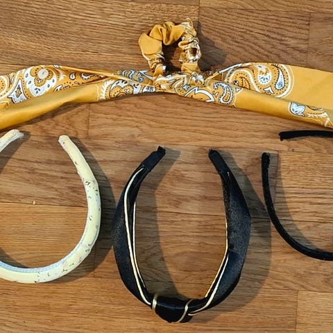 Vihreä geometrisesti taiteltu ruusuke hohtavaa kangasta. Ruusuke on ommeltu kiinni ohueen metalliseen hiuspantaan. Istuu kauniisti päänmyötäisesti.