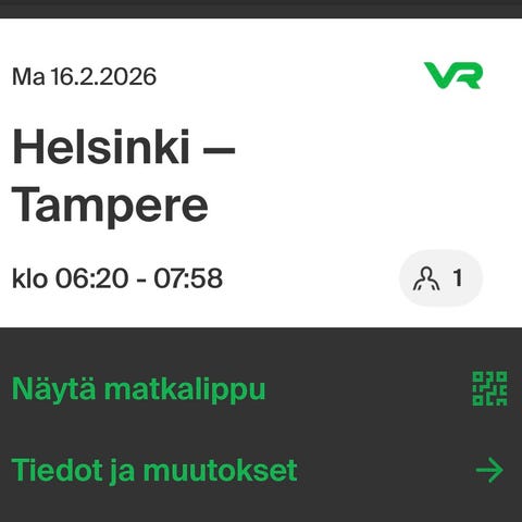 Myydään junalippu aikuinen Mikkeli–Helsinki. Su 15.2. klo 14:40–17:25.