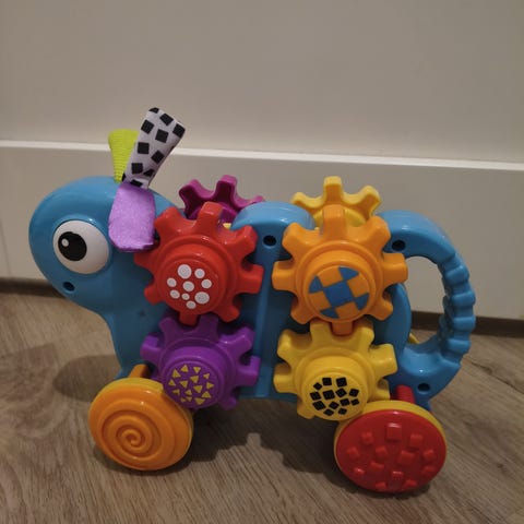 Värikäs vauvan junalelu, joka liikuttaessa soittaa musiikkia ja ampuu palloja, saa vauvan nauramaan