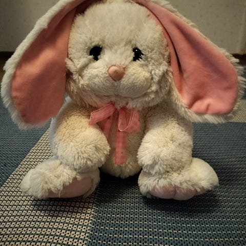 Pehmoinen, puhda, vähällä käytöllä ollut pupu. Korvia/jalkojaan vetämällä ja säädettyä niitä pitkiksi/lyhyiksi.