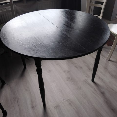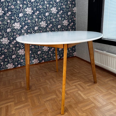 pyöreä valkoinen pöytä. on vanha joten käytönjälkiä löytyy ja muutenkin vähän kulunut. muuten hyvässä kunnossa ja on tukeva myös.