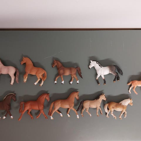 Schleich hevosfiguurit setti. Kuvissa useita erivärisiä hevosia ja varsoja. Muovisia leikkieläinhahmoja, jotka sopivat esimerkiksi maatila- ja hevosleikkeihin tai kokoelmaan. Loimen/ loimun/ mikälie? saa mukaan myös jos haluaa