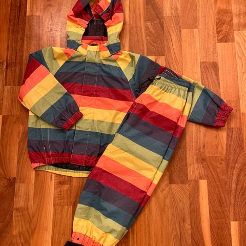Ei uudenveroinen mutta hyvä käytetty kunto. Värit kirkkaat. Polvissa ja pyllyn puolella kangas nukkaantunut, ja polvien kohdalla lahkeista reunaheijastimet kuluneet.