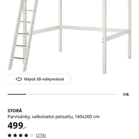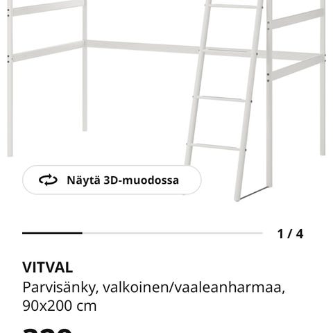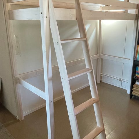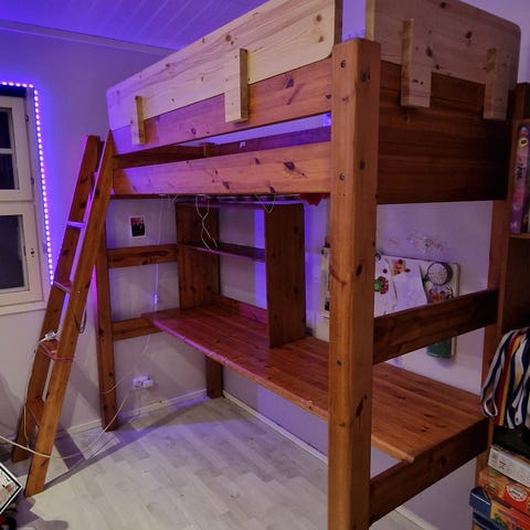 Parvisänky pöydällä ja hyllyillä. 185,5cm korkeus lattiasta korkeimpaan kohtaan. Pituus 207cm. Siisti.