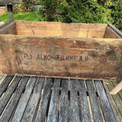 Patinoitunut historiaa huokuva numeroitu puulaatikko E4956 Oy Alkoholiliike Ab, pituus n.90cm leveys n.45cm korkeus n.33 cm.