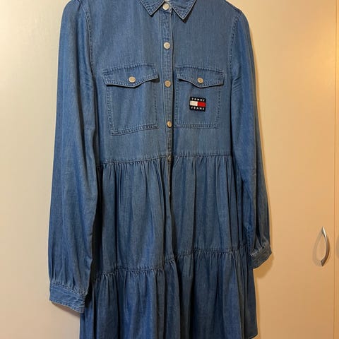 Tommy Hilfiger farkkumekko. Koko XS, menee S -kokoisesta. Pehmeä ja mukava kangas. Mekossa on pitkät hihat, kaulus ja napitus edessä koko pituudelta. Helma on kerroksittain levenevä. Soveltuu arkipukeutumiseen ja kerrospukeutumiseen esimerkiksi neuleen tai takin kanssa. Vähän käytetty.