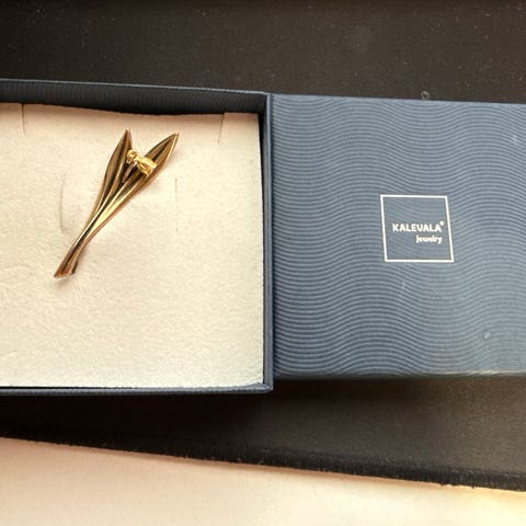 Kalevala korun pronssinen Kielo-rintaneula alkuperäispakkauksessa. Hinta 20€+postikulut