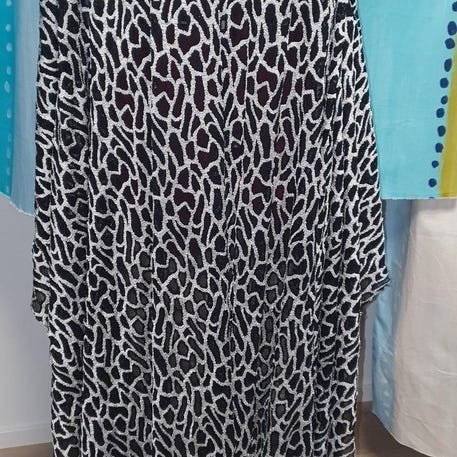 Käyttämätön 200x 80 cm pala joustavaa kangasta, oletettavasti puuvillaa tai jotain puuvillasekoitetta. Toisessa kuvassa näkyy kankaan nurja puoli. Pohjaväri musta, valkoiset kuviot. Nouto Kuopion keskustasta tai ToriDiili-lähetys
