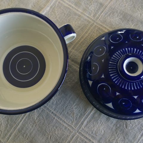 Arabia Valencia -sarjan kulho ja lautanen. Syvä kulho kannella sekä matala lautanen, suunnittelija Ulla Procopé. Väri tummansininen valkoisilla kuvioilla, sisäpuoli valkoinen. Lautasen halkaisija noin 20 cm, kulhon halkaisija noin 18 cm.