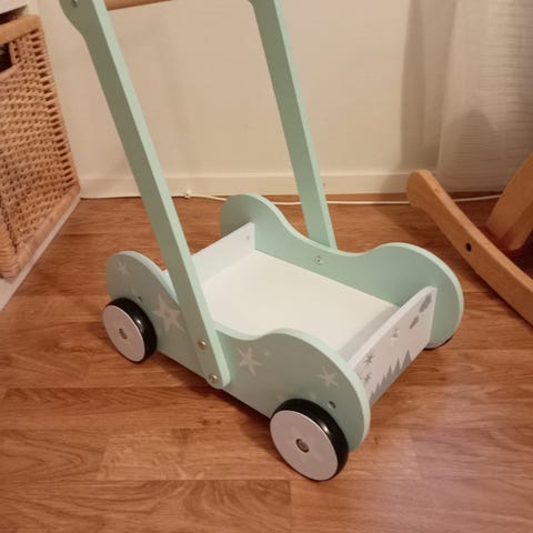 Hyvässä kunnossa oleva taaperokärry. Aukot eri muotoisille palikoille takana. Mukaan myös leikattavat puiset kasvikset.