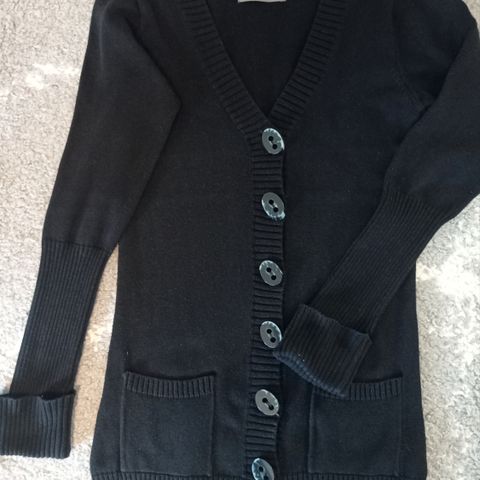 Pitkä musta neuletakki, koko S-M ja materiaali puuvilla-viskoosisekoitetta. Hyväkuntoinen, pientä käytön jälkeä.