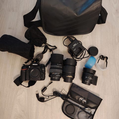 Nikon d7500 ,sigma 70-300,kaukoutki adapter,käytetyyt kaukoputki perassa,laturi ja 2 akut