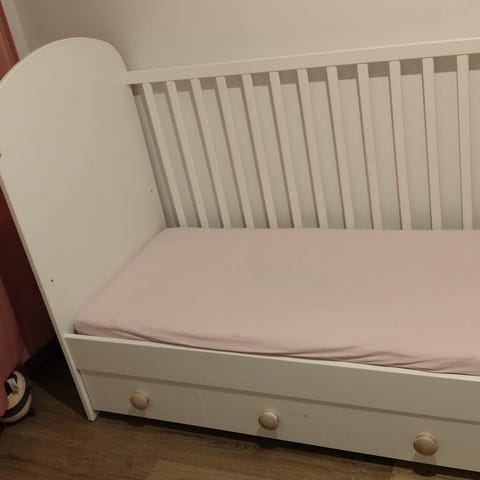 Sängyn alla on kolme vetolaatikkoa pikkutavaroiden säilytykseen, laatikoissa on eriväriset vetimet. Pinnasänky on ostettu uutena IKEAsta Settiin sisältyy myös reunapehmuste, vedenpitävä lakana, sekä kaksi lakanaa.