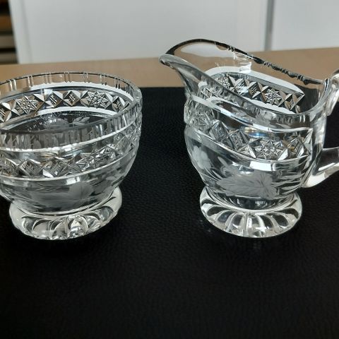 Aimo Okkolin Pirkko hiottu sokerikko ja kermakko hopeajalalla 830, Riihimäen Lasi/Kultakeskus Oy. Kristallia. Hopea jalka kipsitäytteinen. Todella hyväkuntoiset.
